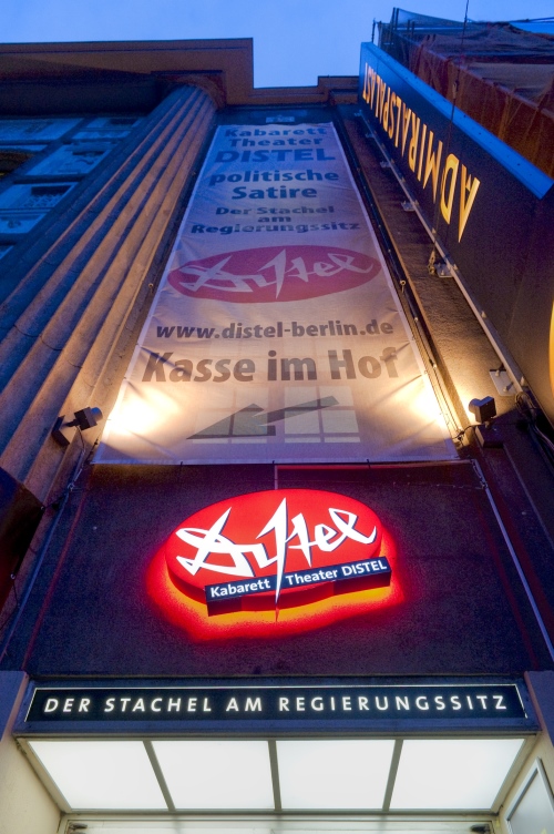 Die DISTEL – Kabarett Theater in Mitte – nennt sich „der Stachel am Regierungssitz“, und feiert im Oktober 2013 ihr 60 jähriges Bestehen, scheinbar unbeeindruckt von den Stürmen der Berliner Geschichte, oder vielleicht treffender gesagt: von den Stürmen der Geschichte durch die Zeiten getragen. Gegründet 1953 im Ostteil und seit dem ansässig im Vorderhaus des Admiralspalasts in der Friedrichstraße, erlebte das jeweilige Ensemble der satirischen Bühne hautnah den Spagat zwischen politischer Zensur einerseits und Akzeptanz und Bestärkung in der Bevölkerung andererseits. Heute ist die Distel weit bekannt für ihre hauseigenen Satire- und Kabarett-Programme und beliebt als Raum für junge Kabarett-Talente.