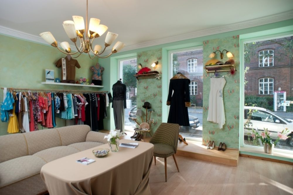 Verführer-Check vor Ort: Zart türkisfarbene Wände mit goldenen Akzenten und einem kleinen Part vorn an den Fenstern, der mit einer Kolibri-Tapete gestaltet wurde, dazu in der Mitte des Raumes ein einladendes Originales Sofa mit Cocktailsesseln. Die Atmosphäre passt perfekt zu den Kollektionsteilen, die an eigens entworfenen Bamusstangen hängen. Ein gestalterisches Gesamtkonzept.