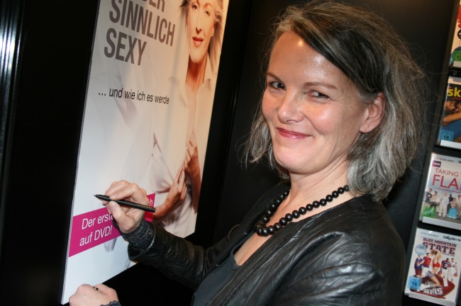 Fotos (erst oben, dann von links nach rechts): Portrait Vanessa del Rae © Inga Haar | Vanessa im Break Free Workshop | Sensuality-School-Leiterin Vanessa mit Maske | Moderatorin und Co-Autorin Vanessa del Rae signiert das Filmplakat von „Silber, sinnlich, sexy“